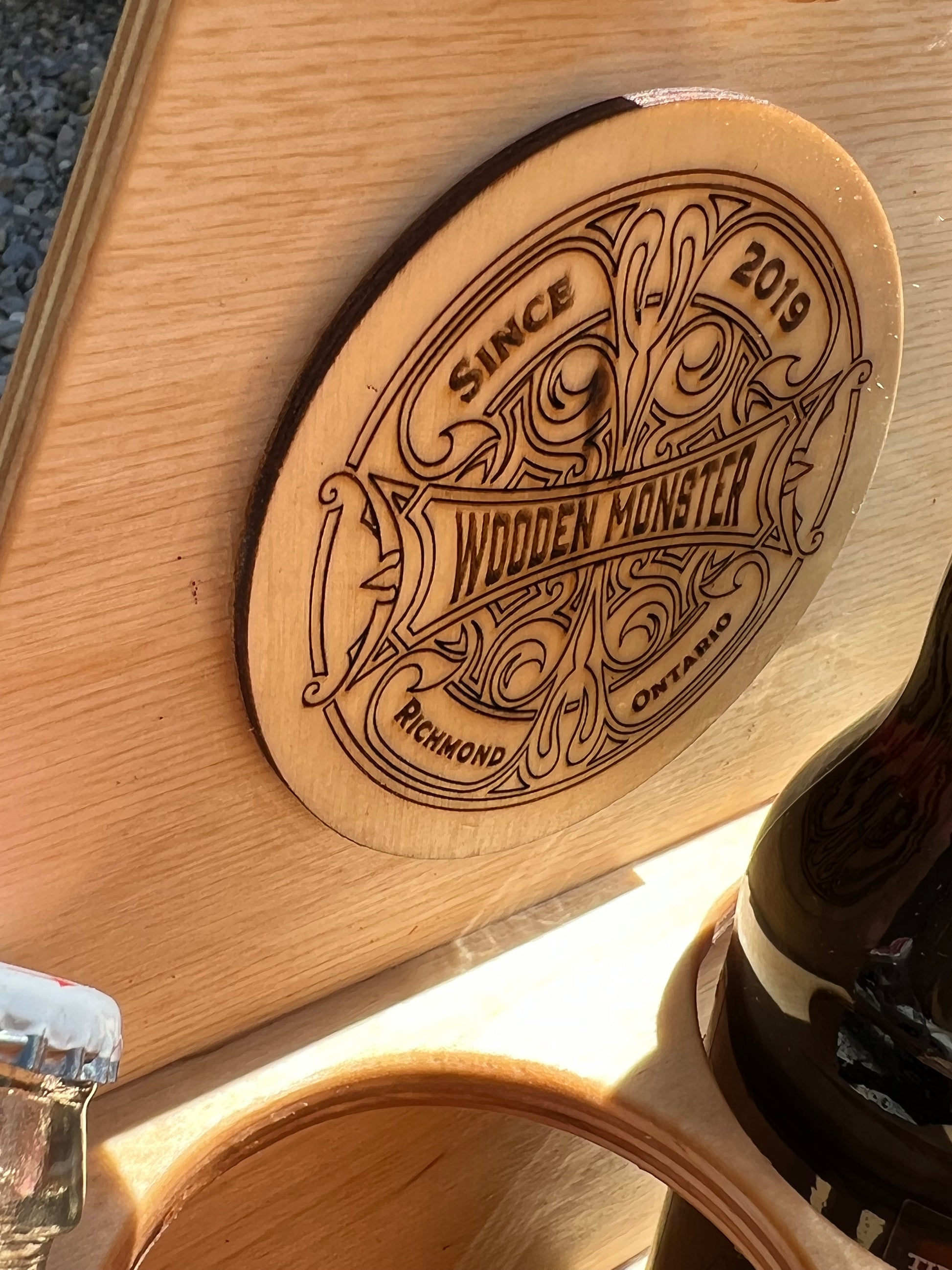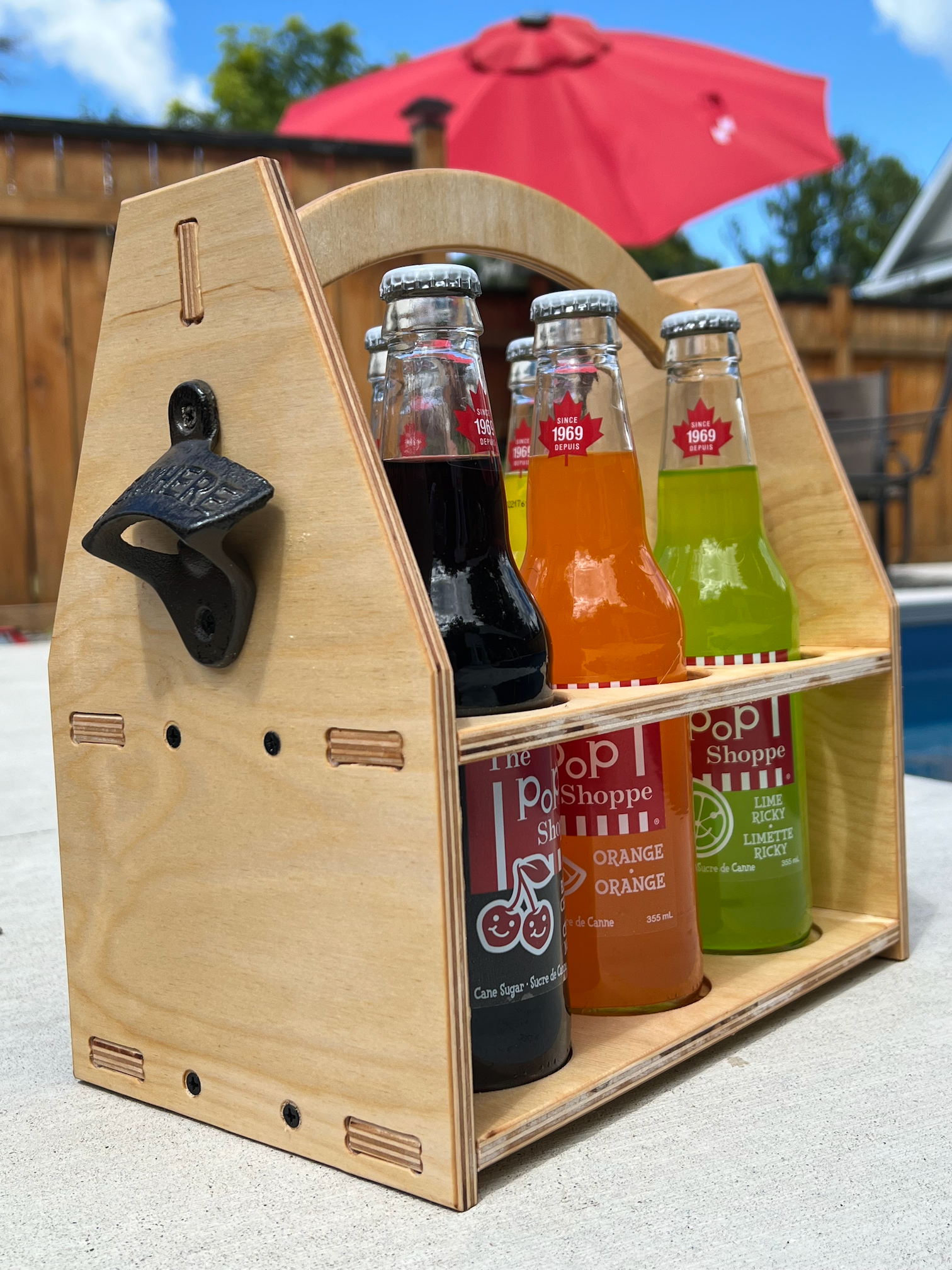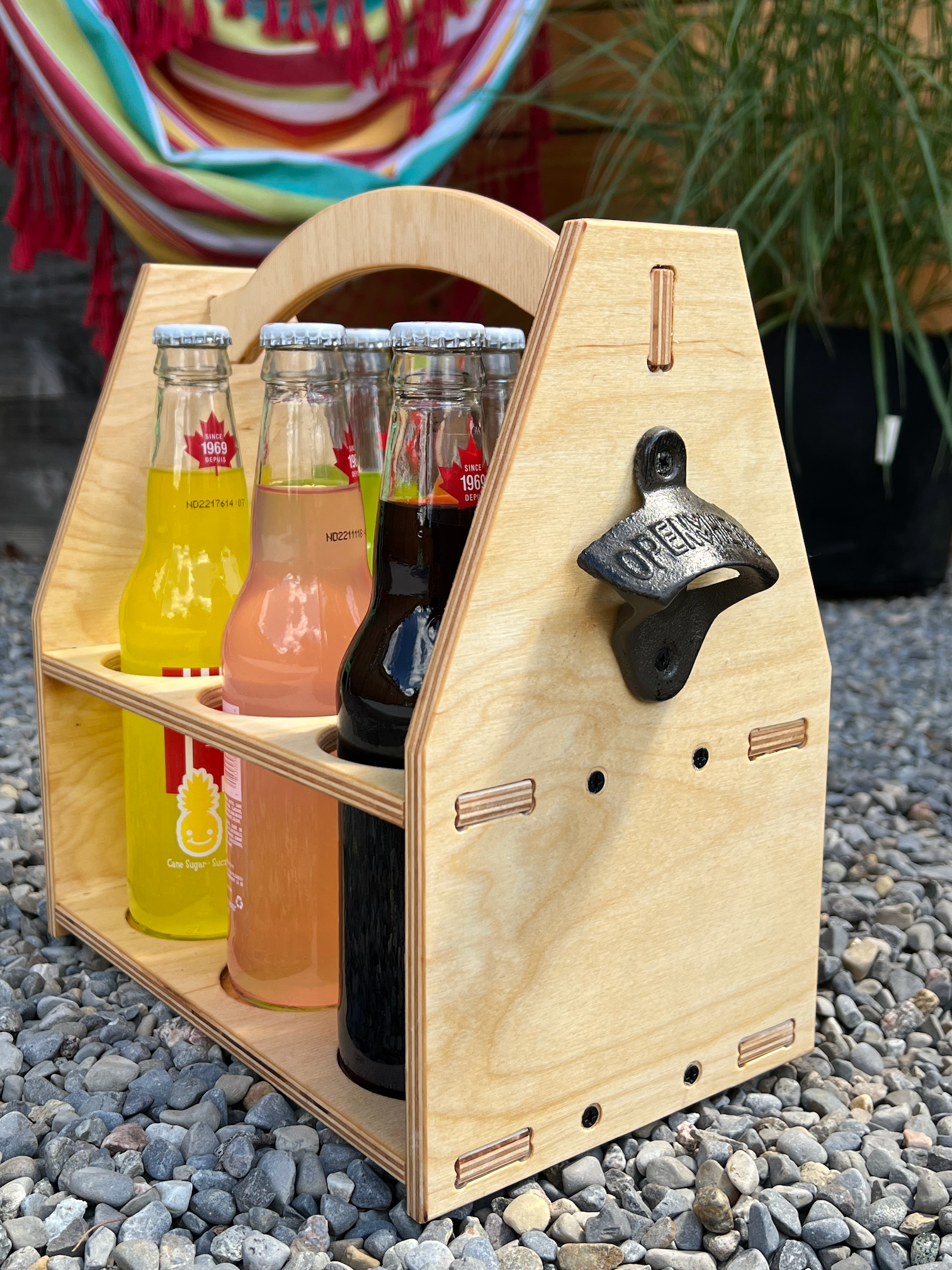 Beverage caddy/tote to hold six of your favourite drinks made with 9mm baltic birch plywood -- seriously overbuilt with slot together construction reinforced with screws. Finished with a durable wax-oil finish.