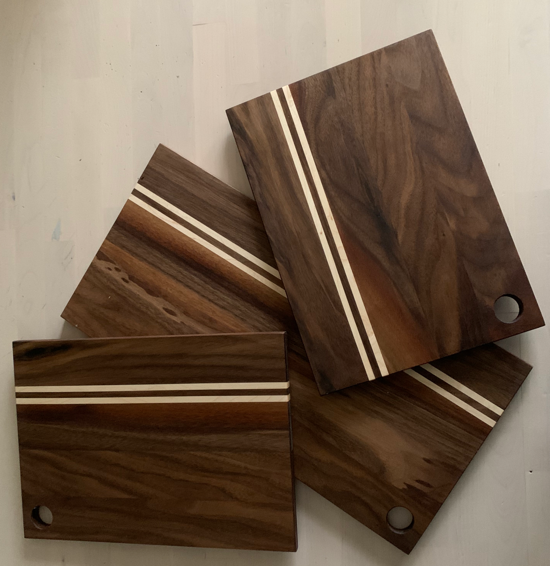 Walnut prep board with two stripes of birdseye maple.