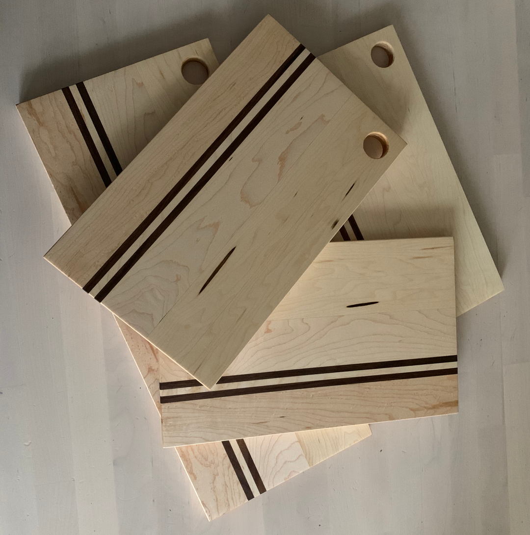 Maple prep board with two stripes of walnut and hole for hanging.