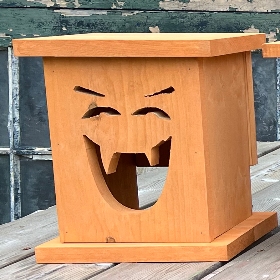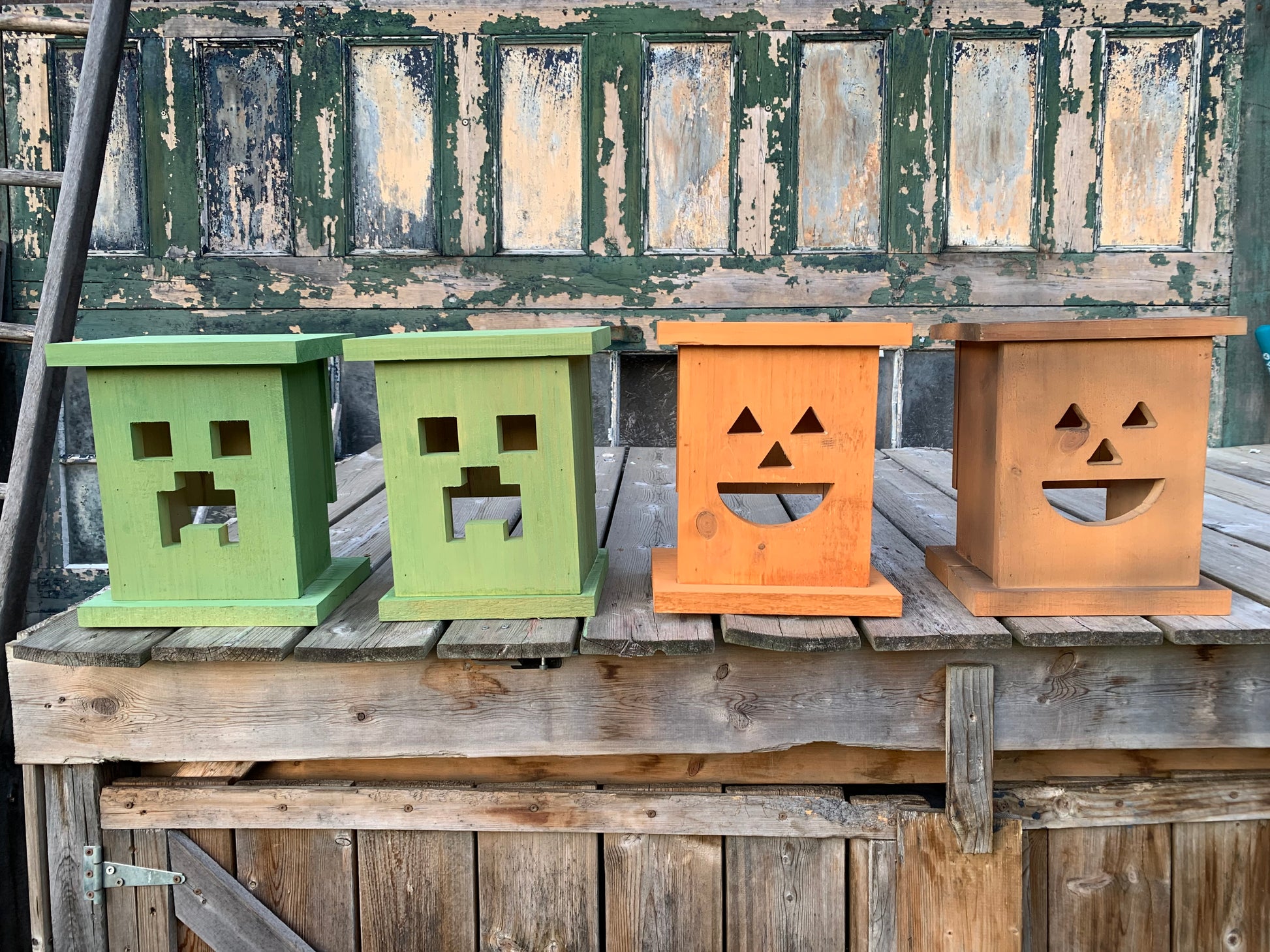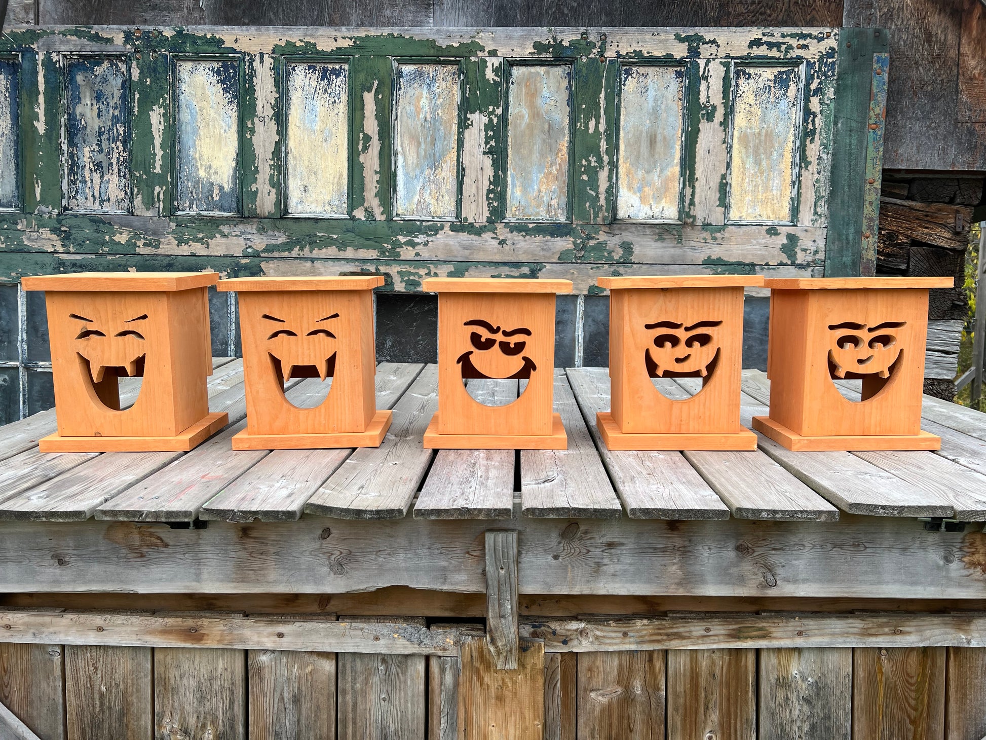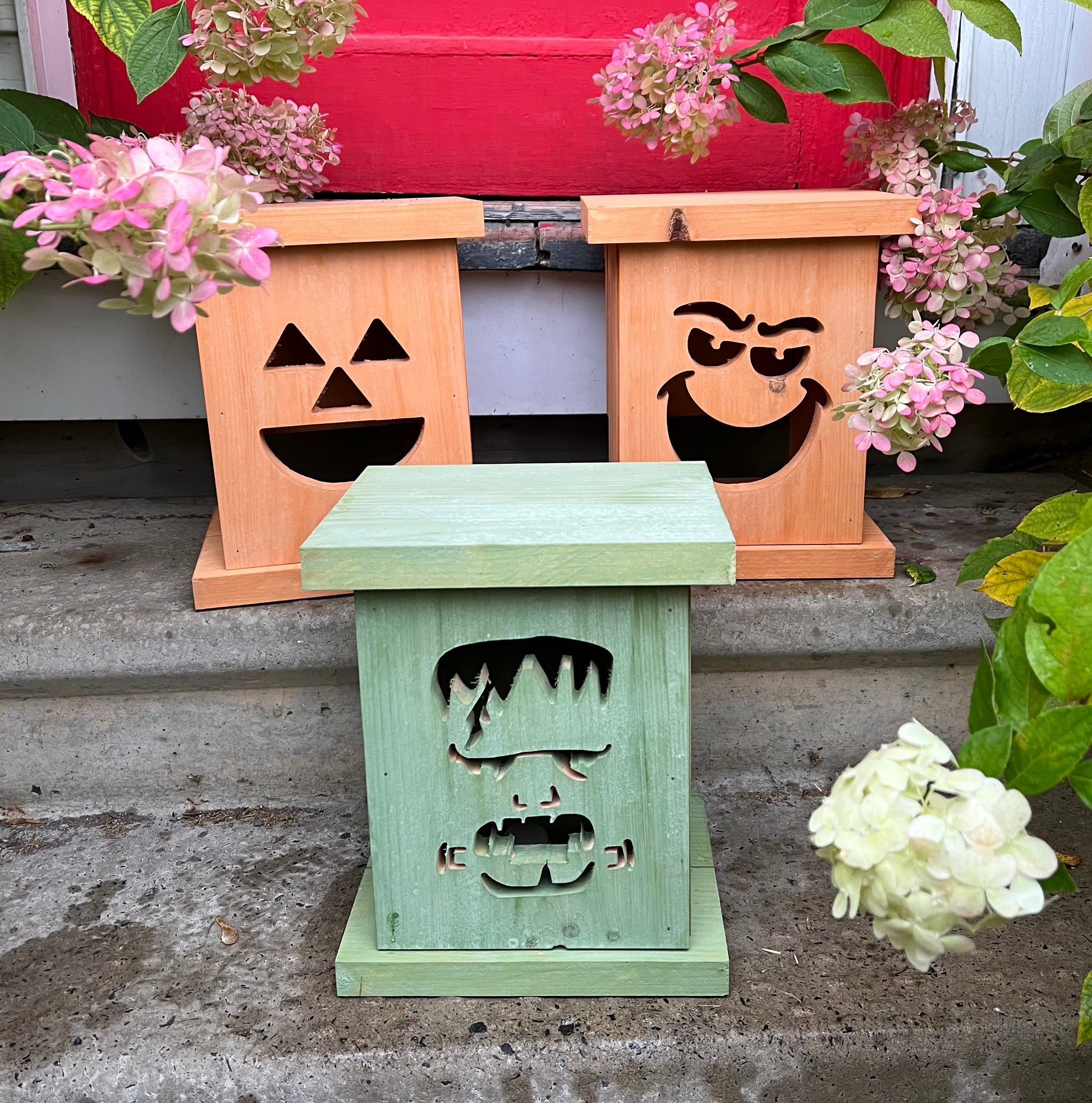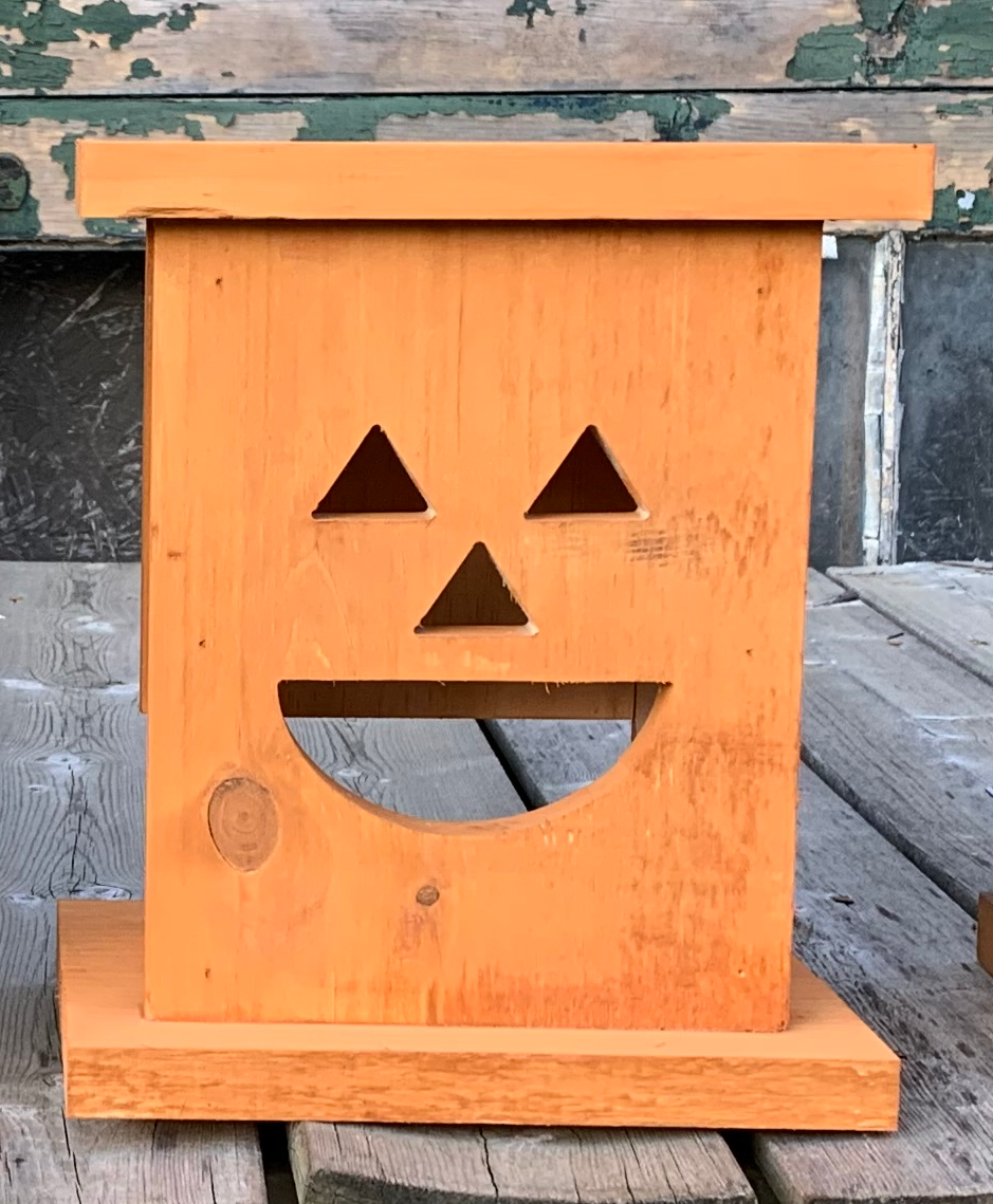 Made of knotty pine, these wooden jack-o-lanterns make a great reusable halloween decoration for your porch or inside your home. Finished with milk paint, they offer a rustic touch for any decor.
