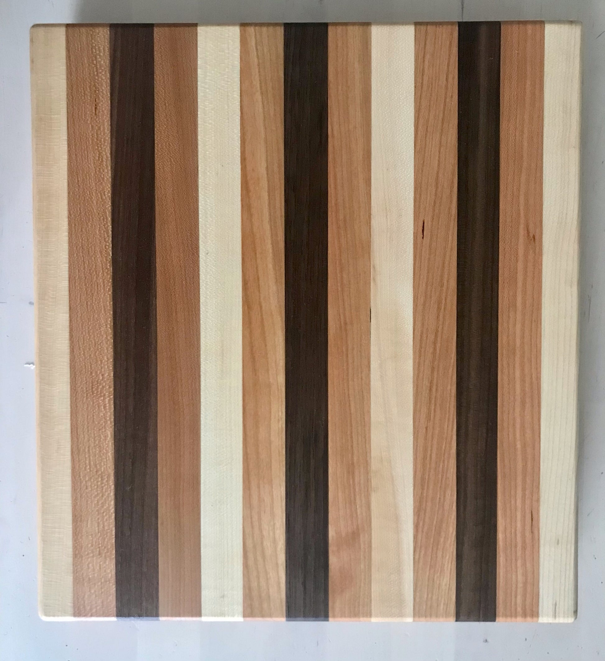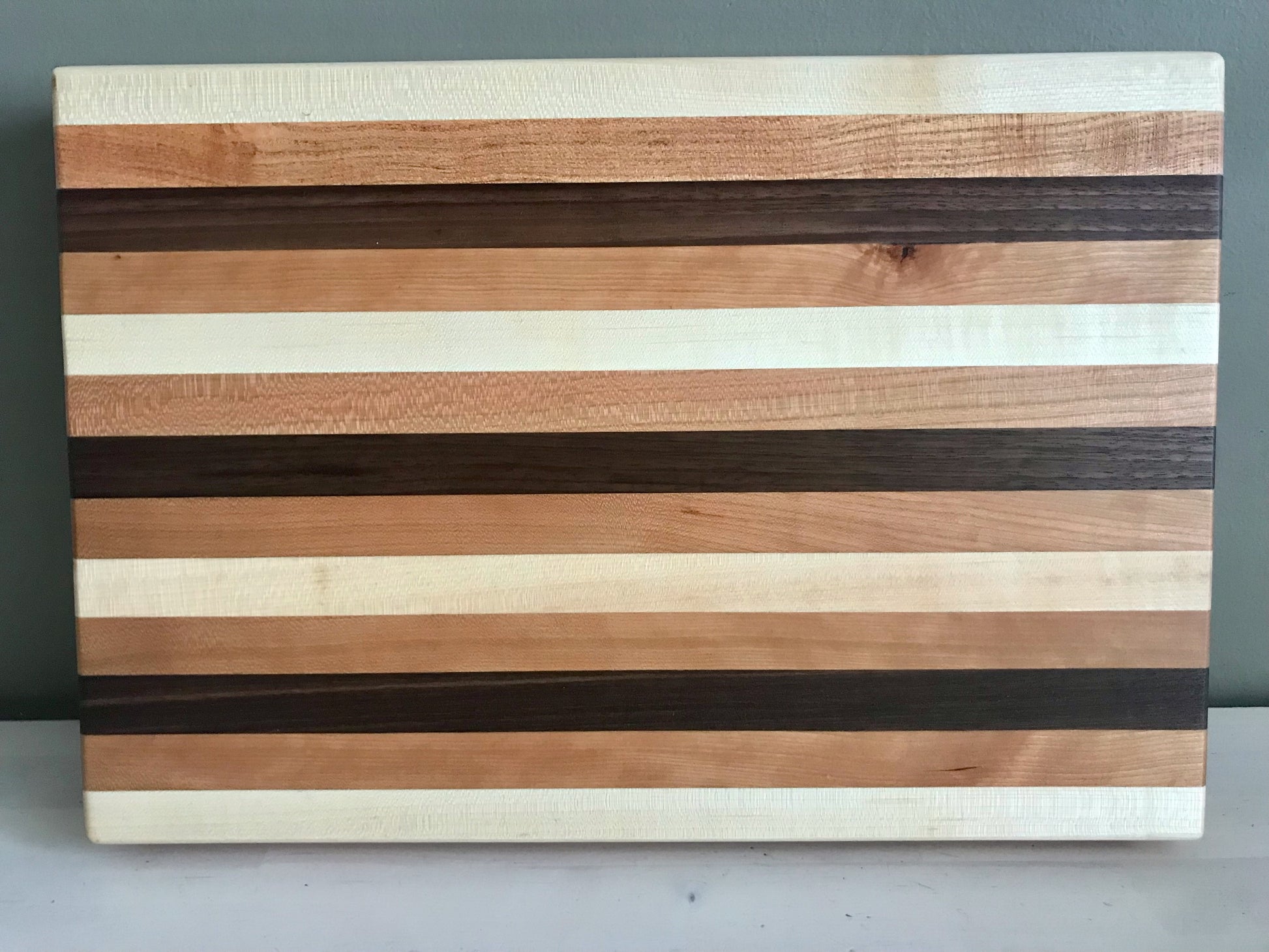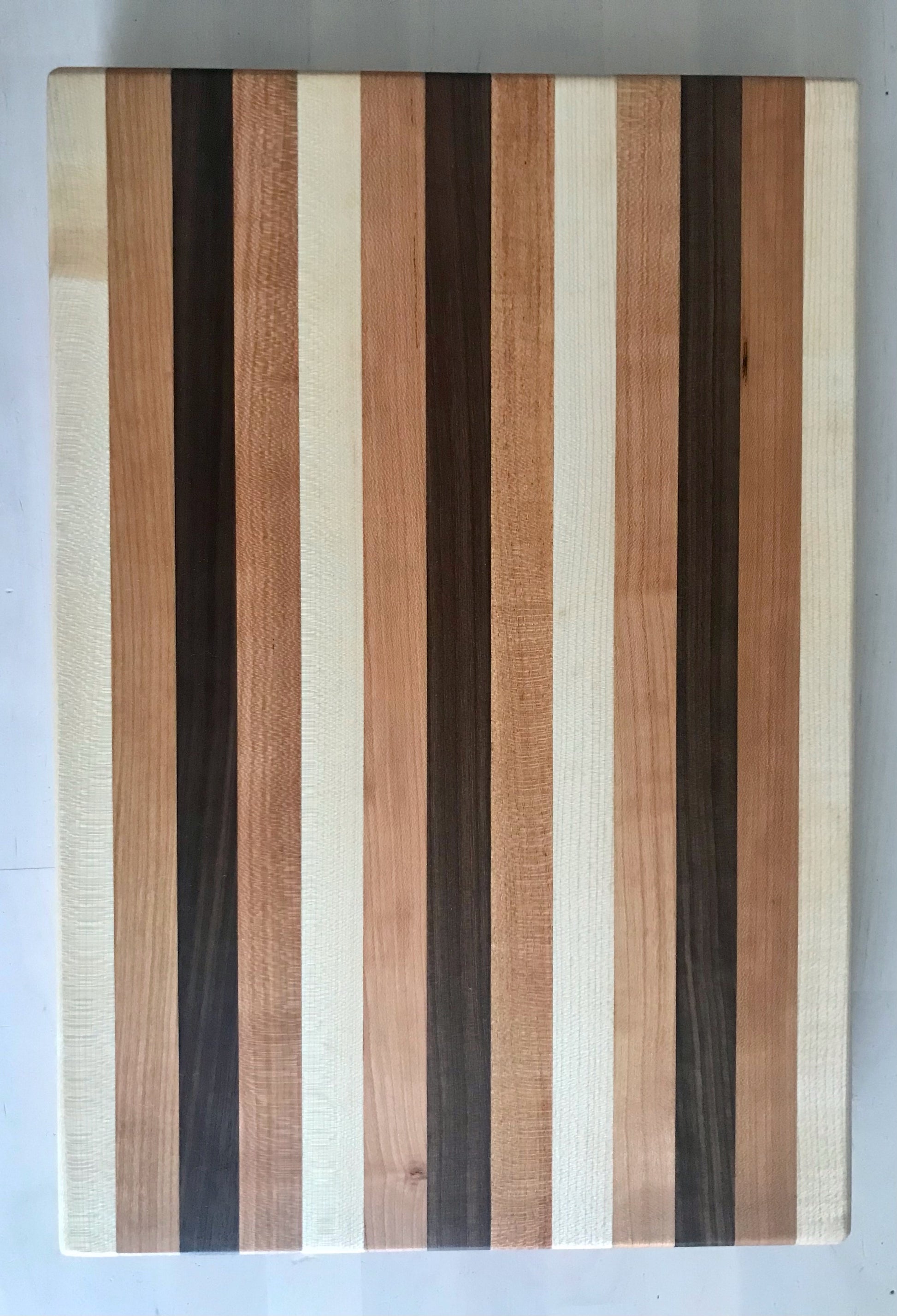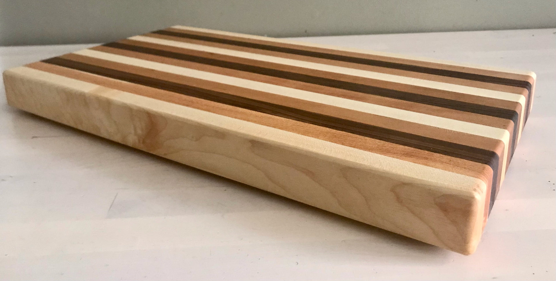 Long grain cutting board with relaxed styling made with domestic hardwoods. Strips of maple, cherry and walnut come together in this classic combination. At 1 3/4" thick with non slip rubber feet this portly gentleman isn't going anywhere!