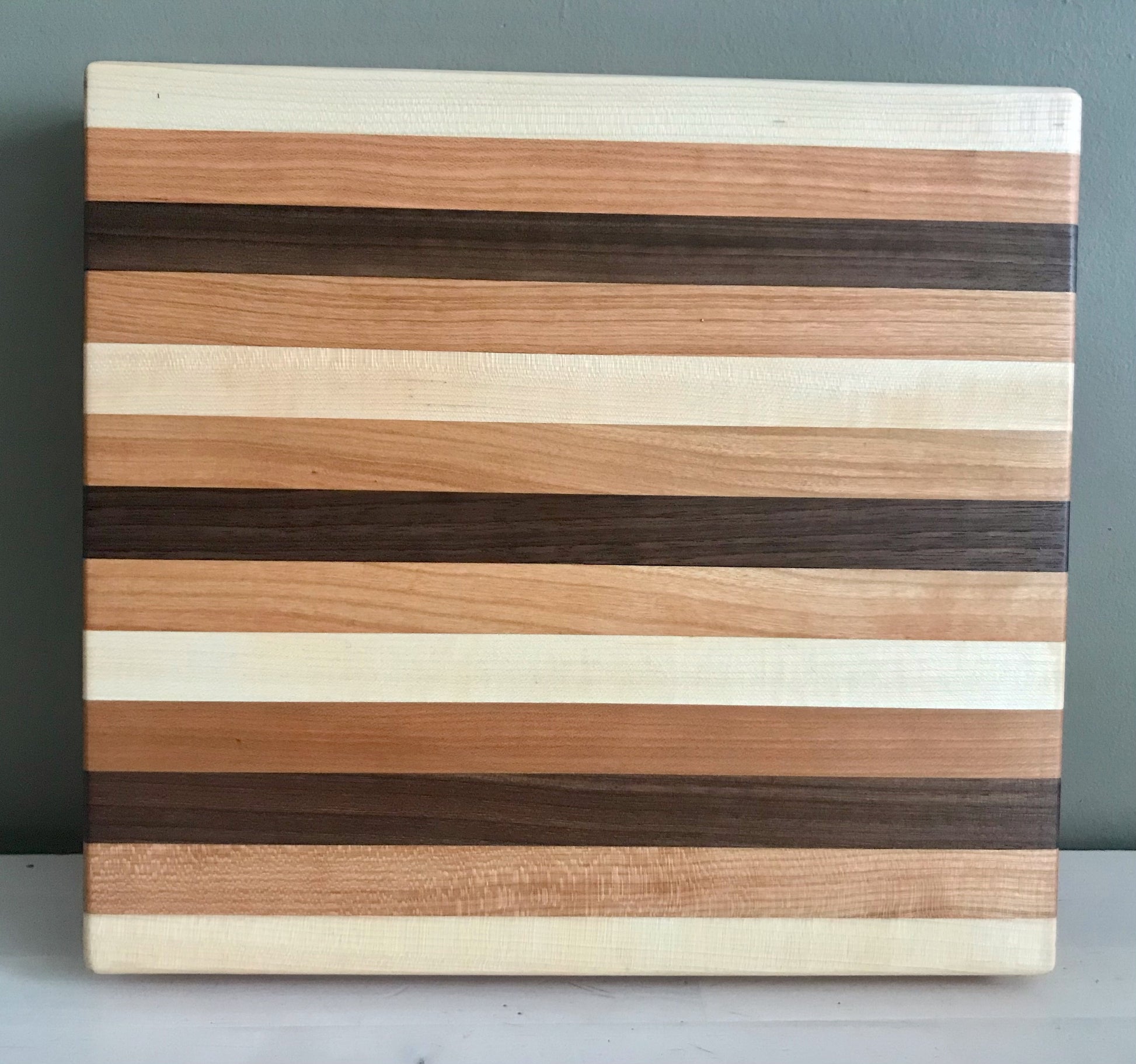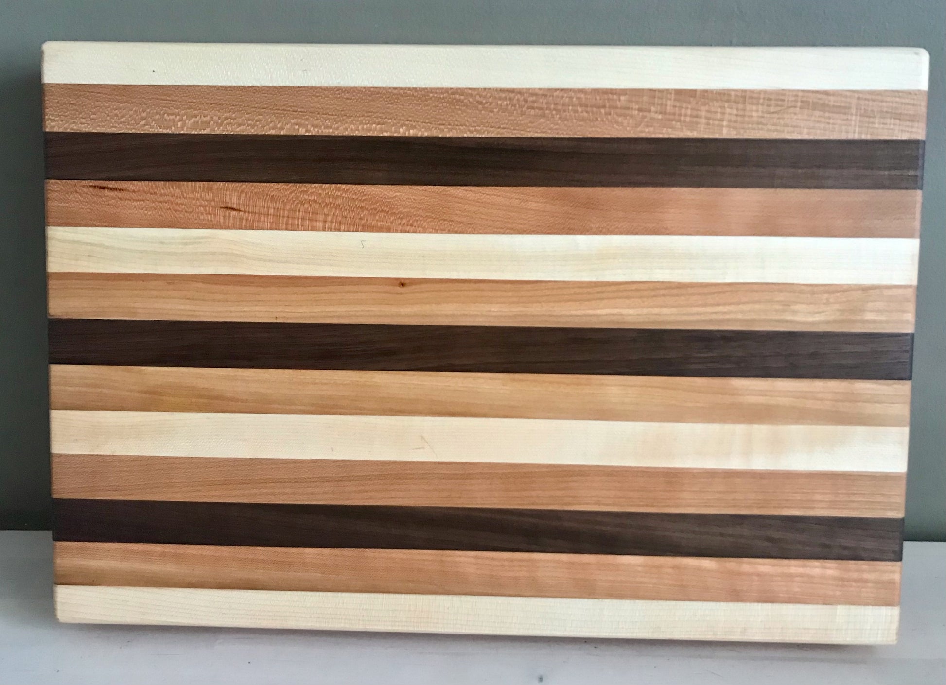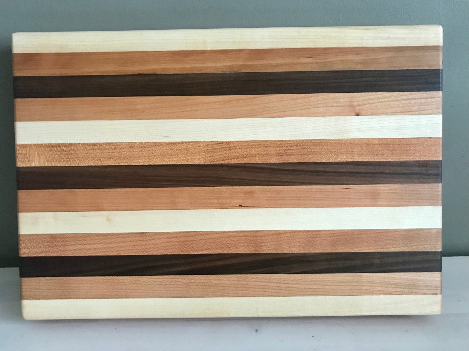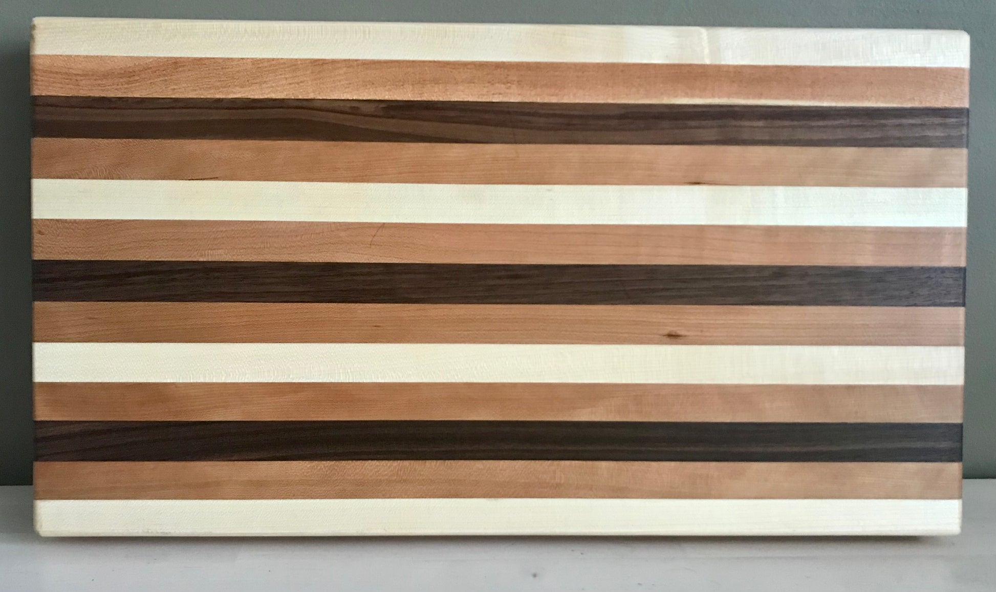 Long grain cutting board with relaxed styling made with domestic hardwoods. Strips of maple, cherry and walnut come together in this classic combination. At 1 3/4" thick with non slip rubber feet this portly gentleman isn't going anywhere!